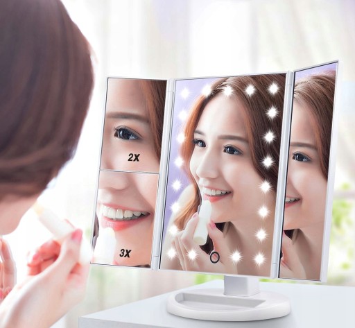 - Lusterko kosmetyczne o regulowanym oświetleniu LED, funkcją rozkładania oraz możliwością włączania oświetlenia za pomocą dotyku, oferuje również opcję powiększenia oraz możliwość obrócenia go o 180 stopni.