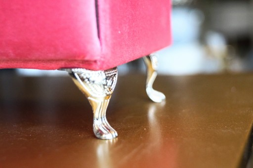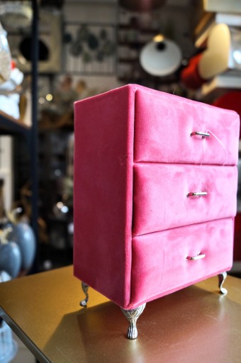 Estetyczna szkatułka na biżuterię i drobiazgi w kształcie małej komody. Wykonana z bardzo dobrej jakości weluru, z dbałością o szczegóły.