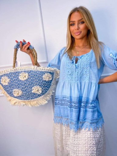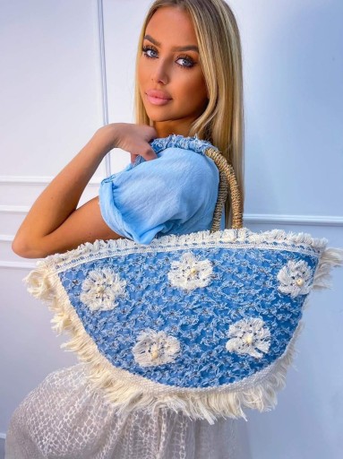Duża torebka koszyk wykonana ręcznie z tzw trawy morskiej Zdobienia w stylu boho wykonane z jeansu, bawełny i juty, 100% wegański i ekologiczny. Zapinana na zamek. Wewnątrz podszewka; jedna kieszonka otwarta Uchwyty o długości umożliwiającej noszenie na ramieniu (długość 54cm)