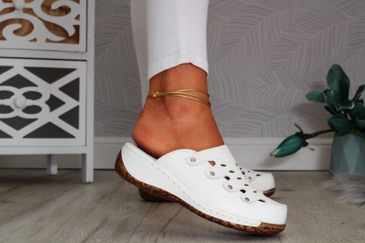 Damskie klapki w kolorze białym na niskiej koturnie. ❤ Wykonane z dobrych jakościowo materiałów. Idealnie sprawdzą się jako obuwie codzienne. Klapki są lekkie i zapewniają wygodę oraz komfort użytkowania. Profilowana, skórzana wkładka z poduszką amortyzującą na pięcie. Podeszwa stabilna, dobrze amortyzuje stopę. Modny, klasyczny fason idealnie dopasuje się do wielu stylizacji! Dobrze prezentuje się na nodze.