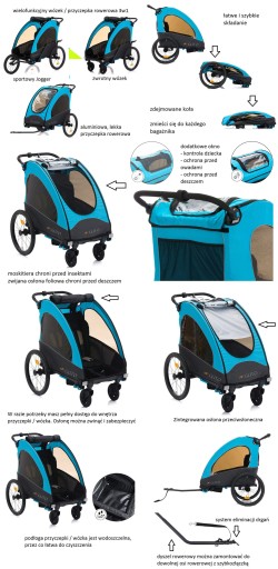 - Zawiera przyczepkę rowerową z kółkiem do wózka spacerówki oraz kółkiem do joggera