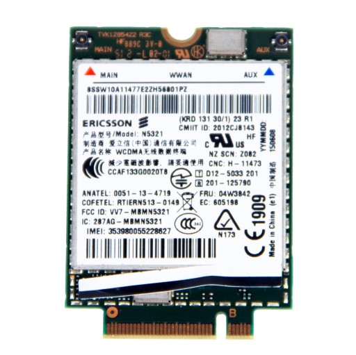 Oryginalny, używany modem Ericsson GSM WWAN 3G/HSPA+/UMTS N5321GW do laptopów Lenovo ThinkPad. Pasuje do modeli X1 Carbon 2 i 3 generacji (2014/2015) i innych. Sprawdzony, w 100% sprawny.