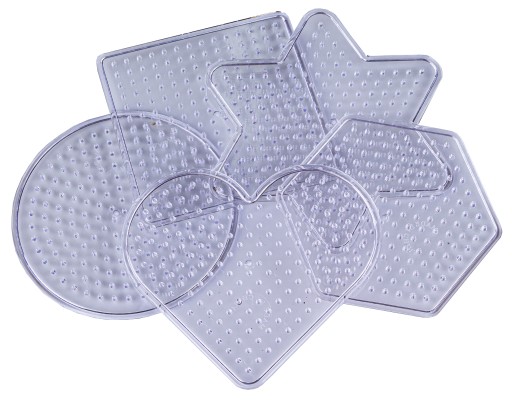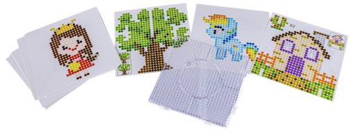 - Podkładki do układania wzorów: 1 duża kwadratowa oraz małe: 1 kwadratowa, 1 okrągła, 1 serce, 1 gwiazdka, 1 heksagon.