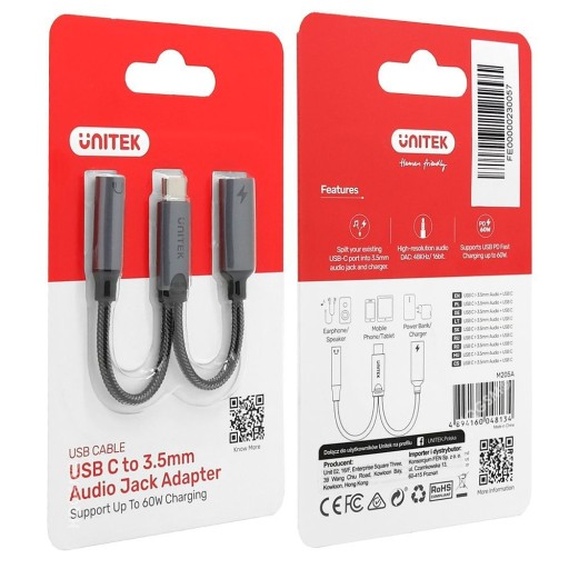 Unitek | Adapter Audio USB-C Jack 3.5mm Ładowanie 60W PD | DAC