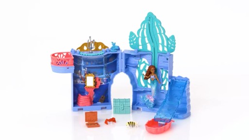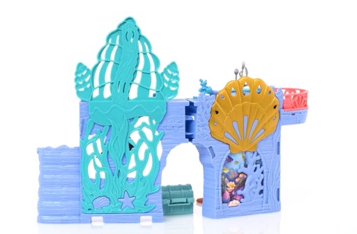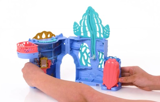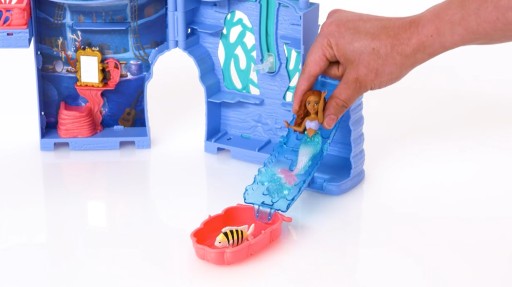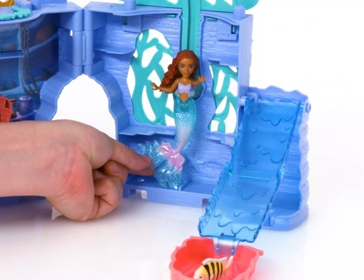 Pływaj w muszelkowym basenie, ślizgaj się po rozkładanej zjeżdżalni i obserwuj, jak Arielka unosząc się na klipsie, odkrywa morskie tajemnice.
