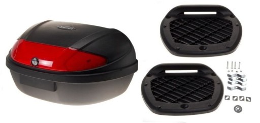 W komplecie załączone są dwa kluczyki, oraz mocowania ze śrubami umożliwiające łatwy montaż. Uniwersalna płyta montażowa, pozwala na montaż prawie na wszystkich bagażnikach w motocyklach jak i skuterach. Kufer spokojnie mieści 2 kaski .