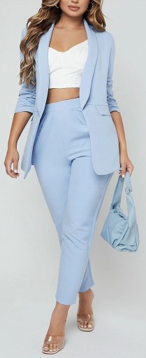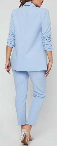 Doskonałe dopełnienie stylizacji do pracy, na uczelnie lub na wieczorne wyjście. Oryginalnego charakteru dodają drapowane rękawy o długości 3/4. Imitacja kieszonek po bokach z efektownymi klapami upiększają marynarkę. Fason luźny, z podszewką i miękkimi poduszkami w ramionach.