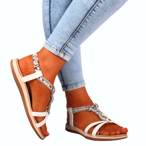 Damskie sandałki w kolorze białym na płaskim spodzie ze zdobionymi paseczkami. Idealnie sprawdzą się jako obuwie na co dzień w letnie, upalne dni. Prosty fason dopasuje się również do eleganckich stylizacji. Elastyczny pasek przy pięcie ułatwia zakładanie obuwia i ułatwia jego dopasowanie do stopy. Miękka, profilowana wkładka zapewnia komfort użytkowania.