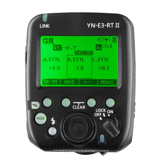 Sterownik YN-E3-RT II może pracować z lampami w trybach: Manualnym, Multi (stroboskopowym), E-TTL II/ E-TTL. W odświeżonym modelu wyzwalacza zaimplementowano kafelkowe menu wyboru trybów wyzwalania błysku oraz poprawiono wygląd pokrętła nastaw.