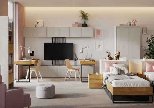 Dzięki ciekawemu połączeniu uniwersalnych kolorów system ten sprawdzi się zarówno w pokojach dziewcząt jak i chłopców. Matowe fronty w kolorze szarości w połączeniu z dekorem ciepłego drewna oraz klimatycznym wbudowanym oświetleniem led odmienią każde wnętrze.