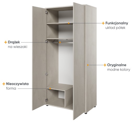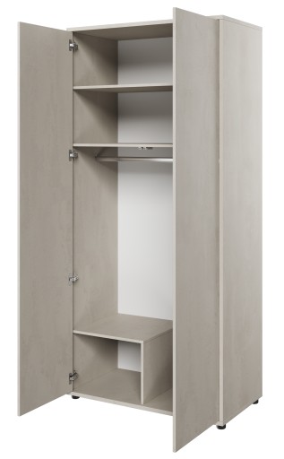 Szafa dwudrzwiowa wyposażona została w długi drążek na ubrania oraz funkcjonalny układ półek.