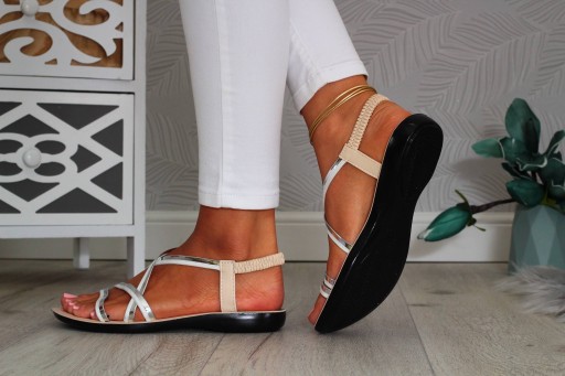 Damskie sandały w kolorze beżowym na płaskim spodzie. Sprawdzą się zarówno jako obuwie na co dzień w letnie, upalne dni. Prosty fason dopasuje się wielu stylizacji, a ozdobne srebrne paseczki dodadzą uroku każdej z nich. Gumowy pasek przy kostce ułatwia zakładanie obuwia oraz dopasowanie go do stopy.