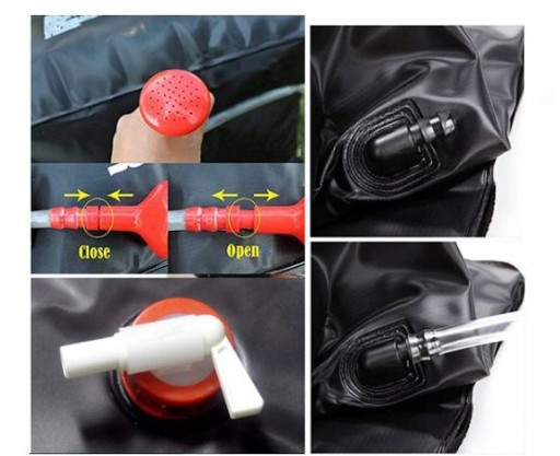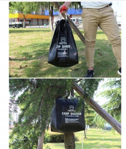 Nienapełniony prysznic jest lekki i zajmuje niewiele miejsca - z łatwością zmieści się np. w plecaku. Prysznic można zawiesić na każdym wystającym, stabilnym elemencie - np. uchwycie, drążku, rurze, a nawet gałęzi drzewa (zwróć uwagę jednak na to, że całkowicie napełniony prysznic wody może dużo ważyć - dobierz odpowiednie miejsca zawieszenia do ilości wody jaką wlejesz).