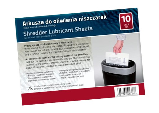 Opakowanie zawiera 10 arkuszy, co pozwala na regularne i skuteczne oliwienie Twojej niszczarki.