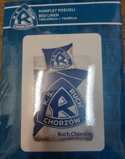 Pościel kompletna w całości w herbie Ruchu Chorzów składająca się z pościeli o wymiarze 160x200 cm oraz z poszewki na poduszę o wymiarze 70x80 cm jest niezbędna dla każdego kibica RUCHU CHORZÓW.