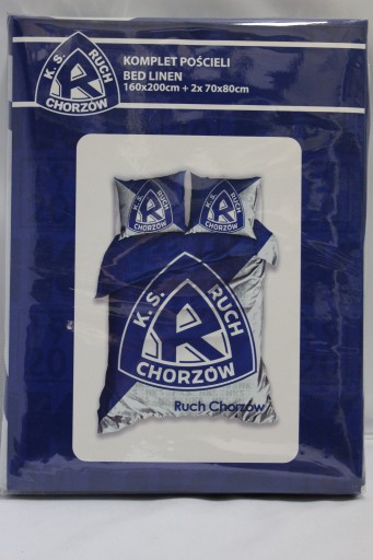 Pościel kompletna Z herbem Ruchu Chorzów składająca się z pościeli o wymiarze: 160x200 cm oraz z dwóch poszewek na poduszki o wymiarze 70x80 cm jest niezbędna dla każdego kibica drużyny piłkarskiej RUCH CHORZÓW.