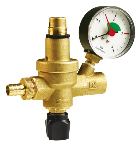 FAM - zawór do automatycznego napełniania instalacji grzewczej z ogranicznikiem ciśnienia, zaworem zwrotnym i odcinającym oraz manometrem.