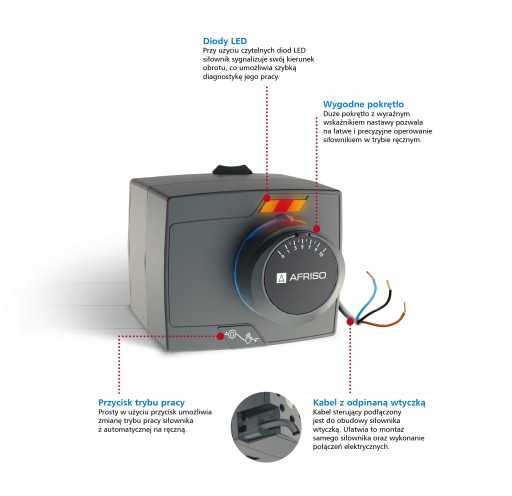 Pokrętło i niebieski pierścień ograniczający, zamontowane są na zaworze na zatrzask. Pod pokrętłem zawsze znajduje się przykręcony adapter do siłowników elektrycznych ARM ProClick. Montaż siłownika odbywa się poprzez nasunięcie go na zawór z adapterem w dogodnej dla użytkownika pozycji. Aby zsunąć siłownik z zaworu wystarczy tylko nacisnąć i przytrzymać przycisk zwalniający mechanizm blokujący.