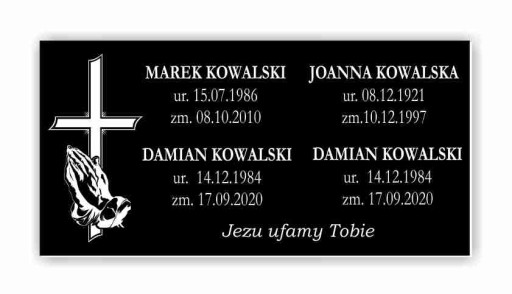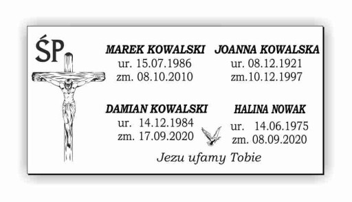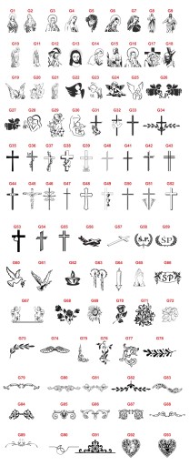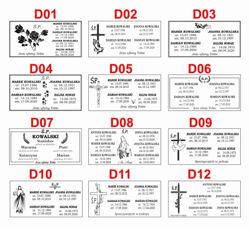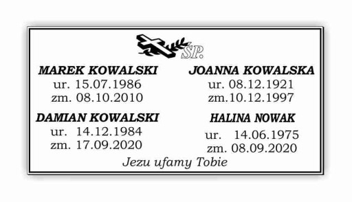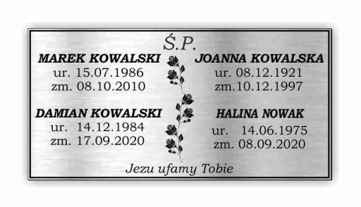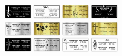 - Jest możliwość wygrawerowania danych większej ilości osób, dowolnej sentencji oraz możliwość drobnej modyfikacji wybranego wzoru tabliczki, zmiana grafiki, czcionki (wzorniki poniżej).