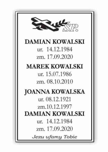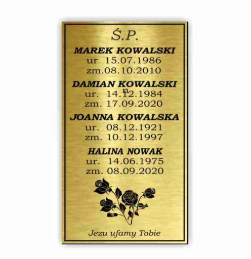 - Jest możliwość wygrawerowania danych większej ilości osób, dowolnej sentencji oraz możliwość drobnej modyfikacji wybranego wzoru tabliczki, zmiana grafiki, czcionki (wzorniki poniżej).