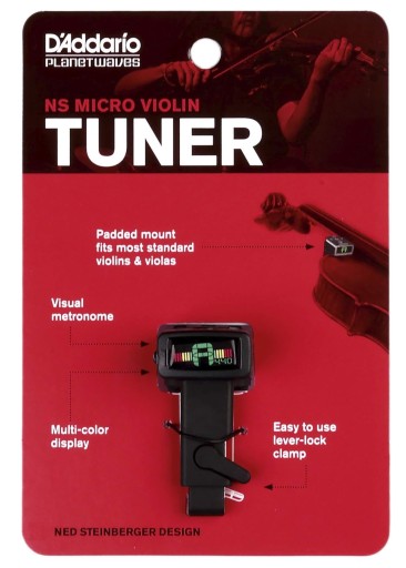 D'Addario Micro Violin / Viola Tuner posiada czytelny, kolorowy wyświetlacz w atrakcyjnej, kompaktowej obudowie. Bezkolizyjny zacisk z blokadą dźwigni utrzymuje tuner bezpiecznie na instrumencie, umożliwiając jednocześnie łatwe nakładanie i zdejmowanie. Precyzyjny tuner skrzypcowy / altówkowy jest nie tylko idealny do strojenia, ale unikalny system mocowania i szybka reakcja na wysokość dźwięku pozwalają na wykorzystanie go jako skutecznego narzędzia do ćwiczeń w celu odniesienia i poprawy intonacji podczas gry.