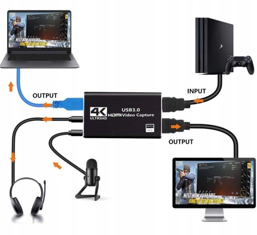 posiada dodatkowe gniazdo wyjściowe HDMI (przelot sygnału), złącza audio do podłączenia słuchawek/mikrofonu oraz oferuje możliwość zapisu Full HD z częstotliwością 60 ramek na sekundę.posiada dodatkowe gniazdo wyjściowe HDMI (przelot sygnału), złącza audio do podłączenia słuchawek/mikrofonu oraz oferuje możliwość zapisu Full HD z częstotliwością 60 ramek na sekundę.Urządzenie współpracuje z komputerami PC wyposażonymi w wolny port USB oraz system Windows 7/8/10, Linux lub MAC OS. Sprzęt korzysta ze sterowników systemowych, nie jest wymagana instalacja z płyty. Po podłączeniu komputer automatycznie wykrywa źródło sygnału i jest ono dostępne w aplikacjach do nagrywania czy streamingu na żywo w sieci. Do obsługi urządzenia polecamy dostępny za darmo program OBS Studio, z którym współpracuje ono bardzo dobrze - program jest dostępny w polskiej wersji językowej a jego obsługa jest prosta. Może służyć zarówno do nagrywania sygnału na dysku jak i transmisji na żywo przez internet.
