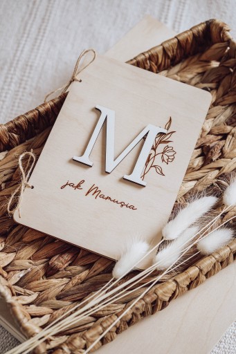 Na okładce ramki znajduje się biała, wypukła literka M jak Mamusia. Kartka złączona jest kokardkami ze sznurka jutowego i z łatwością można ją postawić otwartą na komodzie jako ramkę.