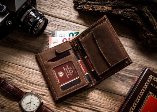 Duży portfel ze skóry naturalnej, bez zewnętrznego zapięcia. Zabezpieczony antykradzieżową membraną RFID Stop. Wewnątrz zakładki na karty i kieszeń na dowód rejestracyjny. Dodatkowo tradycyjne sekcje na gotówkę. Portfel w metalowym etui.