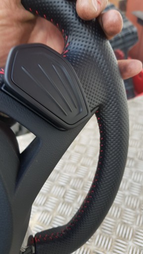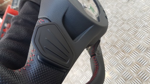 Stan:Kierownica praktycznie idealna obszyta czerwoną nicią, skóra perforowana. Uszkodzony tempomat aktywny.