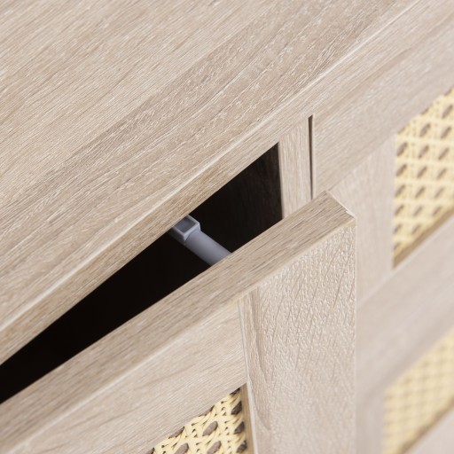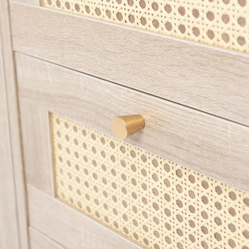 Izolacja przed kurzem: Fronty szuflad z wikliny rattanowej W porównaniu z wydrążoną wikliną, ten model ma dodatkową barierę przeciwpyłową za wikliną, która przedłuża żywotność produktu i zapobiega przedostawaniu się kurzu do szuflad, ułatwiając codzienne sprzątanie.
