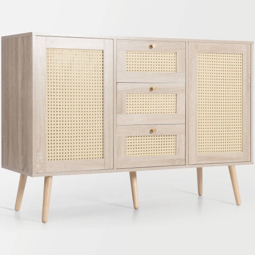 Komoda z 2 drzwiami i 3 szufladami, rattan, dąb sonoma, regulowana półka, nóżki z litego drewna, do salonu sypialnia-120 x 82 x 40 cm (szer./wys./gł.)