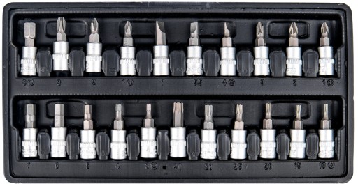 Nasadki bity - 18 szt.: FD 4, 5.5, 7; PH 1, 2; HEX 3, 4, 5, 6; T 8, 10, 15, 20, 25, 27, 30 mm