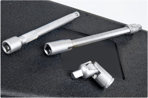 ✅ Szeroki wybór narzędzi, w tym nasadki o różnych rozmiarach, grzechotki, przedłużki, adaptery, pokrętła, bity i wiele więcej