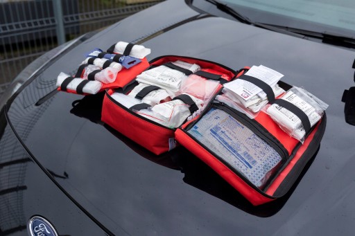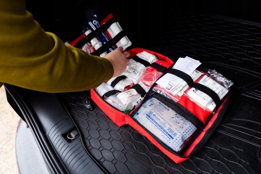 - Bogato wyposażona apteczka samochodowa z zawartością