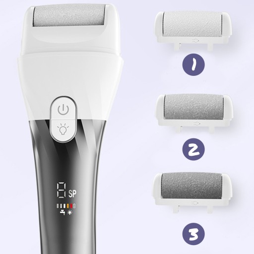 W zestawie znajdują się trzy głowice-rolki kwarcowe, które zapewniają kompleksową pielęgnację stóp i pięt. Każda głowica ma różną drobność ziaren, co umożliwia dostosowanie pielęgnacji do indywidualnych potrzeb i stanu skóry.