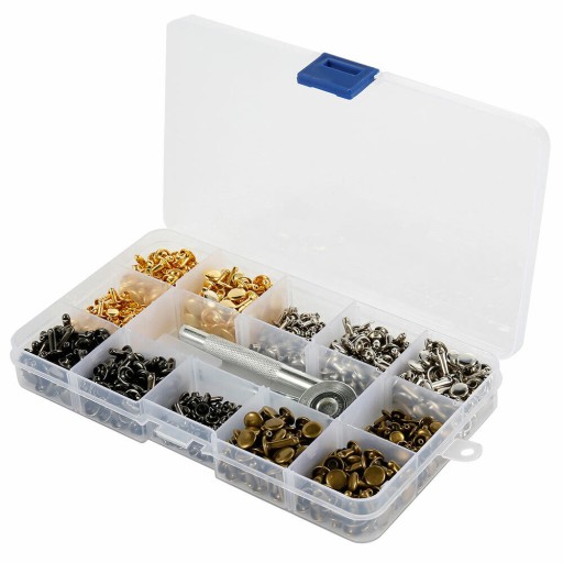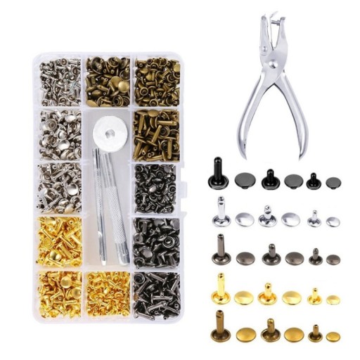 Zestaw 480 elementów z dłuższymi oraz mocniejszymi nitami przeznaczony do skór oraz grubszych materiałów wymagających silnego zapięcia.