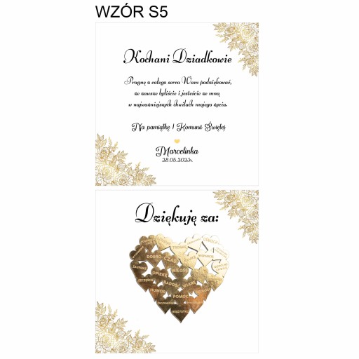 Środek pudełka wypełnia ZŁOTE LUSTRZANE SERCE 3D, które składa się z mniejszych serduszek, na których wygrawerowane są teksty z podziękowaniami.