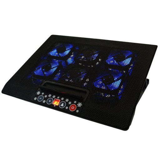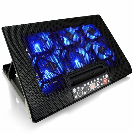 AABCOOLING NC77 Czarna Podstawka pod laptopa to podstawka chłodząca która posiada aż sześć wydajnych i cichych wentylatorów. Doskonała dla bardzo dużych notebooków, które potrzebują mocnej i solidnej podstawy chłodzącej. Za wydajne chłodzenie odpowiada sześć wentylatorów 70mm. Waga ok. 940g zapewnia stabilną podstawę pod laptopa, a w elektronicznym panelu kontrolnym podstawki zostały zaprogramowane cztery tryby prędkości wentylatorów (P1,P2,P3,P4) oraz trzy tryby pracy wybranych wentylatorów (F1-dwa wewnętrzne wentylatory, F2-cztery zewnętrzne, F3-wszystkie), a także przycisk OFF/ON. Estetycznie wykonana, wydajna i cicha podstawka pod laptopa, pracuje generując minimalny hałas tylko 11dB(A), co czyni konstrukcje wyjątkowo cichą. Wentylatory pobierają chłodne powietrze spod podstawki i kieruje je na powierzchnie laptopa, zapewnia bardzo niską emisję hałasu podczas przepływu strumienia powietrza. Hydrauliczne łożyska pracują bardzo cicho. Przy ustawieniu najniższych obrotów wentylatorów hałas jest praktycznie niesłyszalny (tryb SUPER SILENT). Dolna część podstawy posiada sześciostopniową regulację kąta nachylenia, tak aby zapewnić jak największą ergonomię pracy.