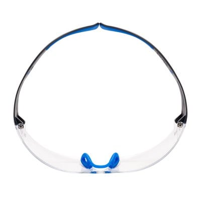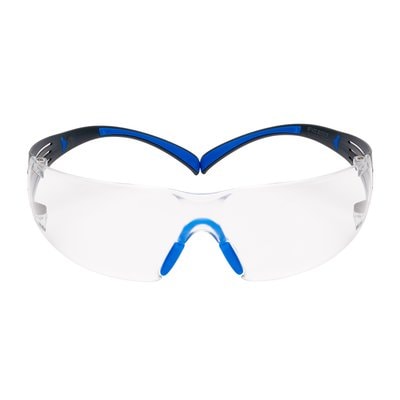 Okulary ochronne SecureFit™ 400 3M™ SF401SGAF BLU EU, z niebieskimi/szarymi oprawkami, powłoką Scotchgard™ Anti Fog i przezroczystymi soczewkami mają soczewki bez oprawek i szerokie, elastyczne ramiona zapewniające solidną ochronę. Są często stosowane w połączeniu z ochronnikami słuchu.