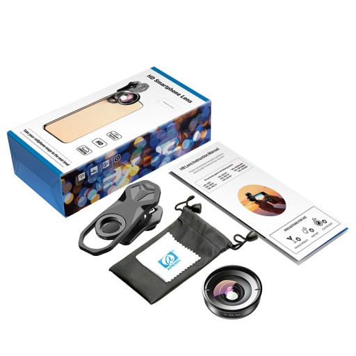 - W zestawie znajdują się: obiektyw, instrukcja obsługi, ściereczka do czyszczenia, pokrowiec, uniwersalny klips, za którego pomocą przymocujesz nakładkę do obiektywu swojego smartfona.