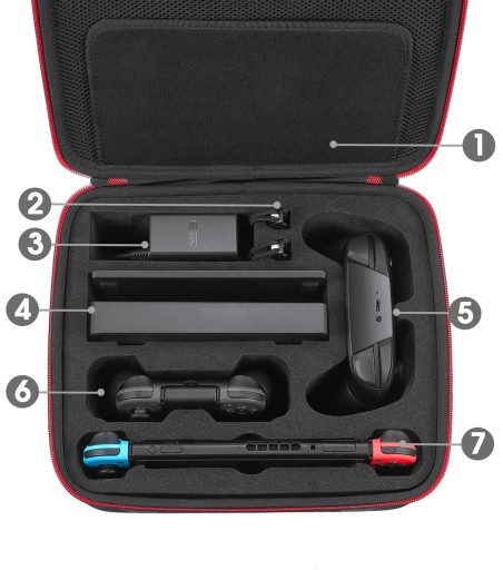 Pomieści konsolę Nintendo Switch / Nintendo Switch OLED (7), stację dokującą Dock'a (4), gamepady (5) (np. Nintendo Switch Pro Controller), ładowarkę sieciową (3), oryginalny grip na Joy-cony (6) oraz uchwyt ze smyczą na Joy-cony (2). W górnej części (1) znajdziemy miejsce na 21 kart z grami.