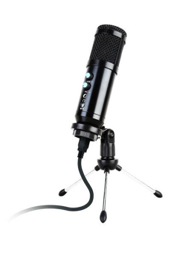Mikrofon pojemnościowy na USB z możliwością regulacji wejścia sygnału mikrofonowego oraz wyjścia sygnału słuchawkowego.
