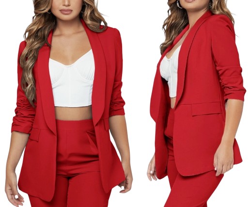 Doskonałe dopełnienie stylizacji do pracy, na uczelnie lub na wieczorne wyjście. Oryginalnego charakteru dodają drapowane rękawy o długości 3/4. Imitacja kieszonek po bokach z efektownymi klapami upiększają marynarkę. Fason luźny, z podszewką i miękkimi poduszkami w ramionach.