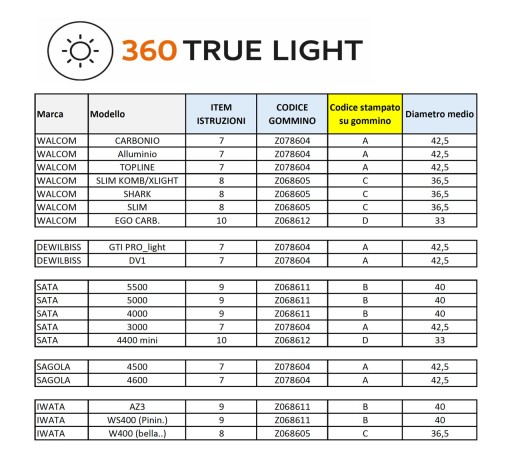 360 TRUE LIGHT jest uniwersalna i dopasowywuje się do 90% pistoletów lakierniczych dostępnych na rynku - dzięki 4 gumowym pierścieniom o różnych średnicach.