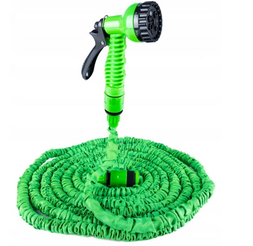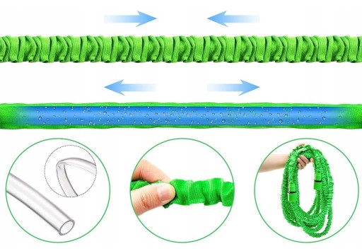 Rozciągliwy wąż ogrodowy wykonany z wysokiej jakości taśmy poliestrowej, lateksu oraz tworzywa ABS.