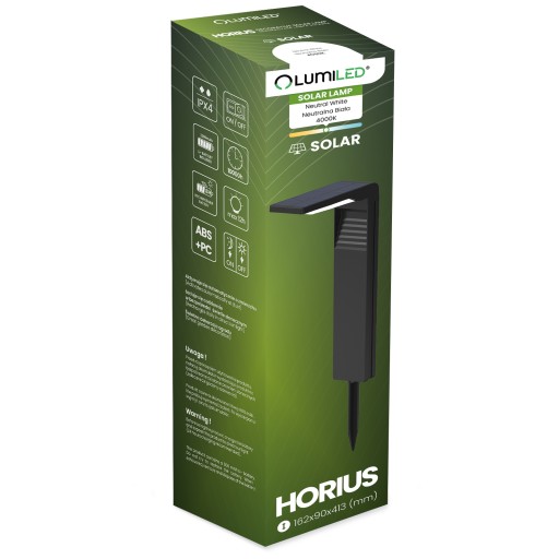 Elegancki, czarny słupek solarny ogrodowy, którego wysokość wynosi 41,3cm ( z grotem 57,5 cm) z serii HORIUS znanej i renomowanej w branży oświetleniowej marki LUMILED!