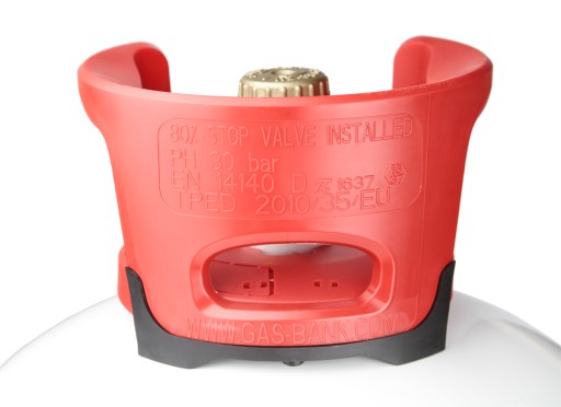 Butle GasBank LS wyposażone są w zawór OPD z urządzeniem zapobiegającym napełnieniu butli powyżej 80% pojemności.