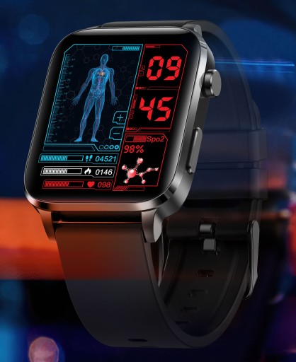 DUŻY I CZYTELNY WYŚWIETLACZ HD 1,7" O WYSOKIEJ ROZDZIELCZOŚCI / MATERIAŁY NAJWYŻSZEJ JAKOŚCI / POJEMNA BATERIA 200mAh / TERAPIA LASEREM 650nm/ GLUKOMETR / FUNKCJA CARE FOR (OPIEKA NA OSOBĄ STARSZĄ) / TERMOMETR / CIŚNIENIOMIERZ / PULSOKSYMETR / 25 ZMIENNYCH TARCZ / WIADOMOŚCI NA EKRANIE / WODOODPORNOŚĆ IP67 / SPORT / MENU ZEGARKA i APLIKACJA W J.POLSKIM