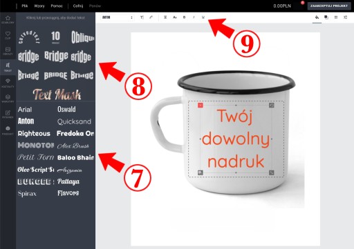 7️⃣ (7) - Wybierzesz jedną z wielu dostępnych czcionek (krojów pisma), umieścisz dowolny tekst na kubku