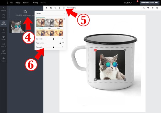 6️⃣ (6) - Na zdjęcie lub grafikę które załadujesz możesz dodatkowo nałożyć filtry, możesz sprawić w jednej sekundzie, że zdjęcie kolorowe stanie się czarno-białe lub nałożysz dodatkowe filtry, zmienisz jasność, kontrast